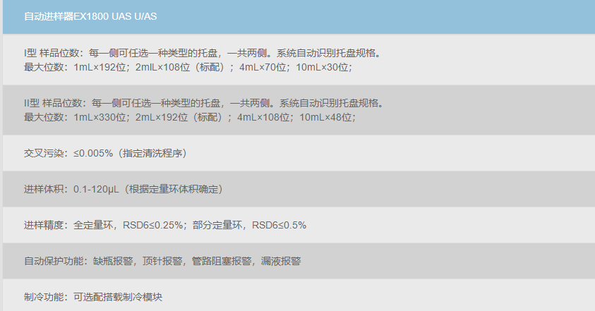 4.提供兩種選配方案:標(biāo)準(zhǔn)和超高效四重保護(hù)裝置,可選配搭載制冷功能可編程進(jìn)樣程序,進(jìn)行樣品的預(yù)處理,實現(xiàn)自動稀釋、自動柱前衍生等功能