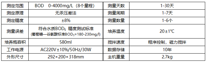 (葡萄糖—谷氨酸標(biāo)準(zhǔn)BOD5=180-230mg/l)培養(yǎng)溫度20±1℃培養(yǎng)瓶容積580ml攪拌速度程序控制,磁力攪拌工作電源AC220V±10%/50Hz/30W數(shù)據(jù)存儲(chǔ)10年外形尺寸292×200×318mm主機(jī)重量2.7kg產(chǎn)品測(cè)定參數(shù)