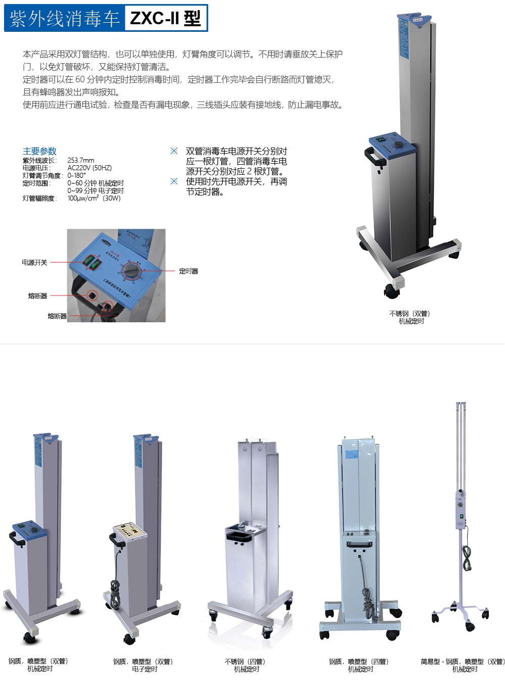雙管消毒車電源開關分別對應一根燈管,四管消毒車電源開關分別對應2 根燈管。