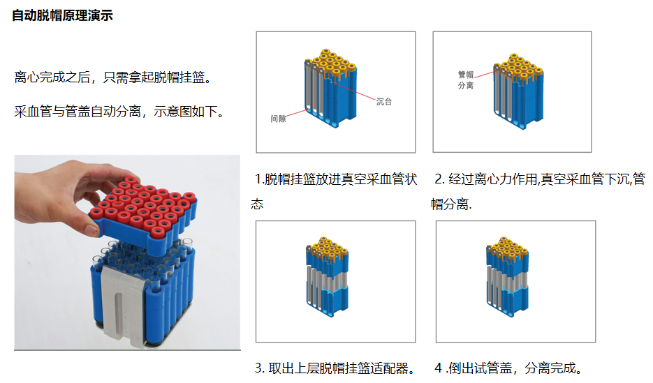 · 目前各級(jí)醫(yī)院在采集血液樣品時(shí),普遍使用真空采血管,在使用離心機(jī)完成血液離心后人工拔去管蓋,效率低;同時(shí),拔管是產(chǎn)生的振動(dòng)可能導(dǎo)致血液重新混合,并且增加病菌感染的風(fēng)險(xiǎn)。本公司研制的自動(dòng)脫帽離心機(jī)脫蓋效果顯著,徹底解決了各級(jí)醫(yī)院往年真空采血管脫蓋難的問(wèn)題,是各級(jí)醫(yī)院用于血液離心的離心儀器。