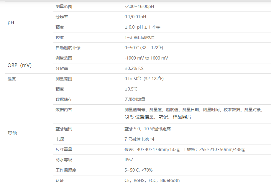 測(cè)量范圍:-2 to 16.00 pH,0 to 50˚C (32-122˚F);精度:±0.01pH,±0.5˚C