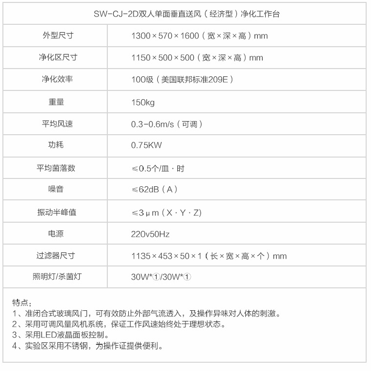 蘇州智凈雙人單面水平流凈化工作臺(tái)(準(zhǔn)閉合式門)SW-CJ-1C